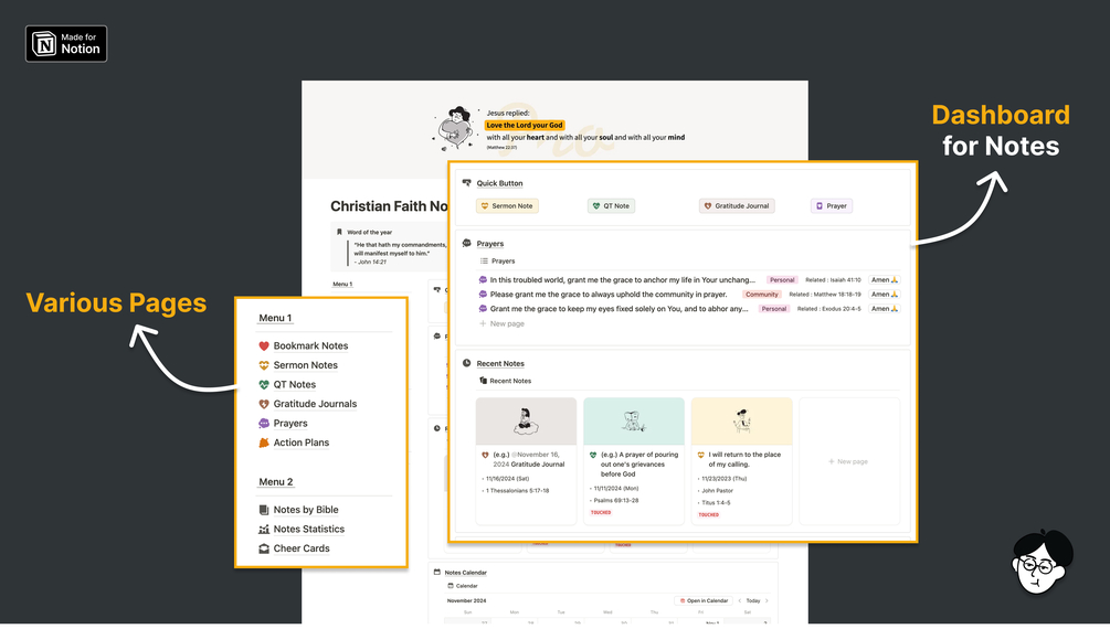 An all-in-one template for Christian Notion users. Organize and manage everything from Sermon Note, QT, Gratitude Journal, Prayer in one place.